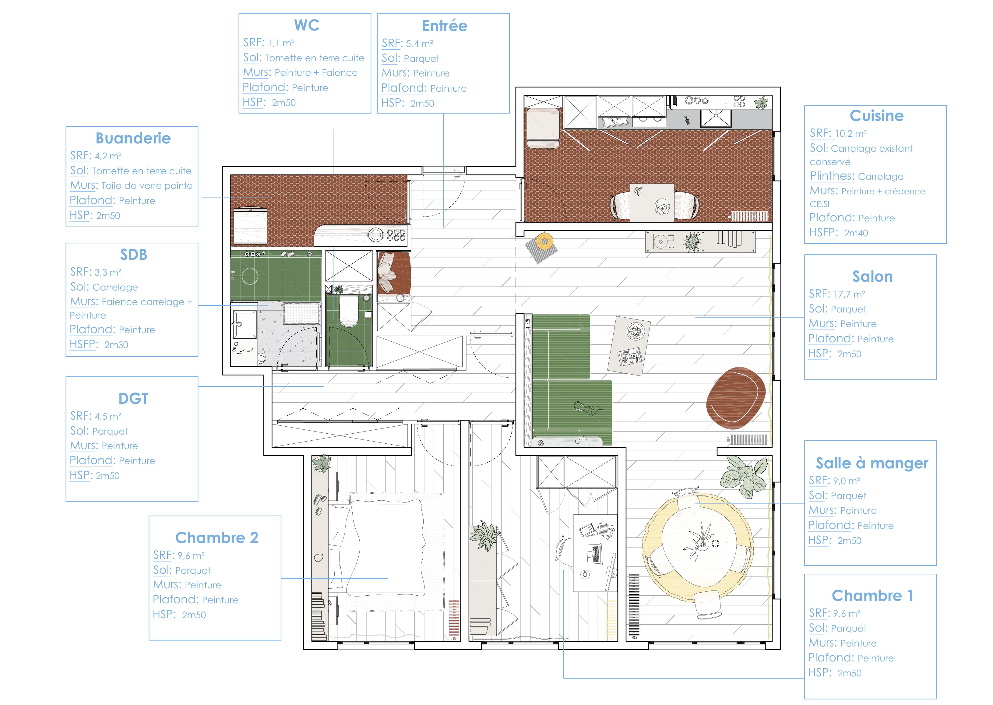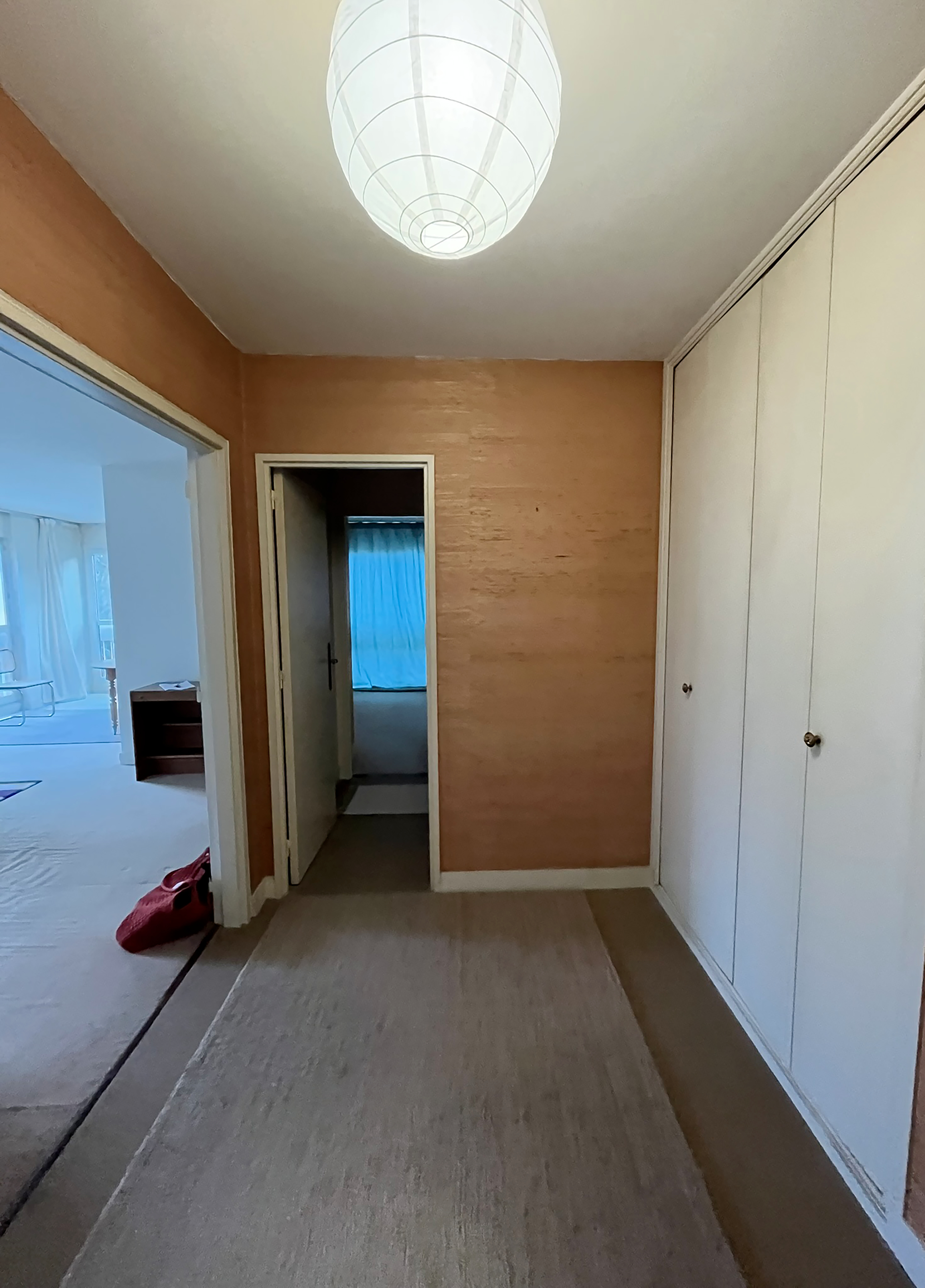 Projet: Rénovation complète d’un appartement comprenant la dépose des revêtements existants, la création d'une nouvelle cuisine, la reprise complète de la SDB et des WC, la pose de parquet ainsi que la réalisation de rangements sur mesure et l'aménagements des espaces annexes.